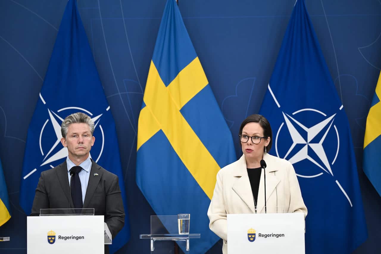 Försvarsminister Pål Jonson (M) och utrikesminister Maria Malmer Stenergard (M) håller pressträff om Sveriges bidrag till Natos avskräckning och försvar.